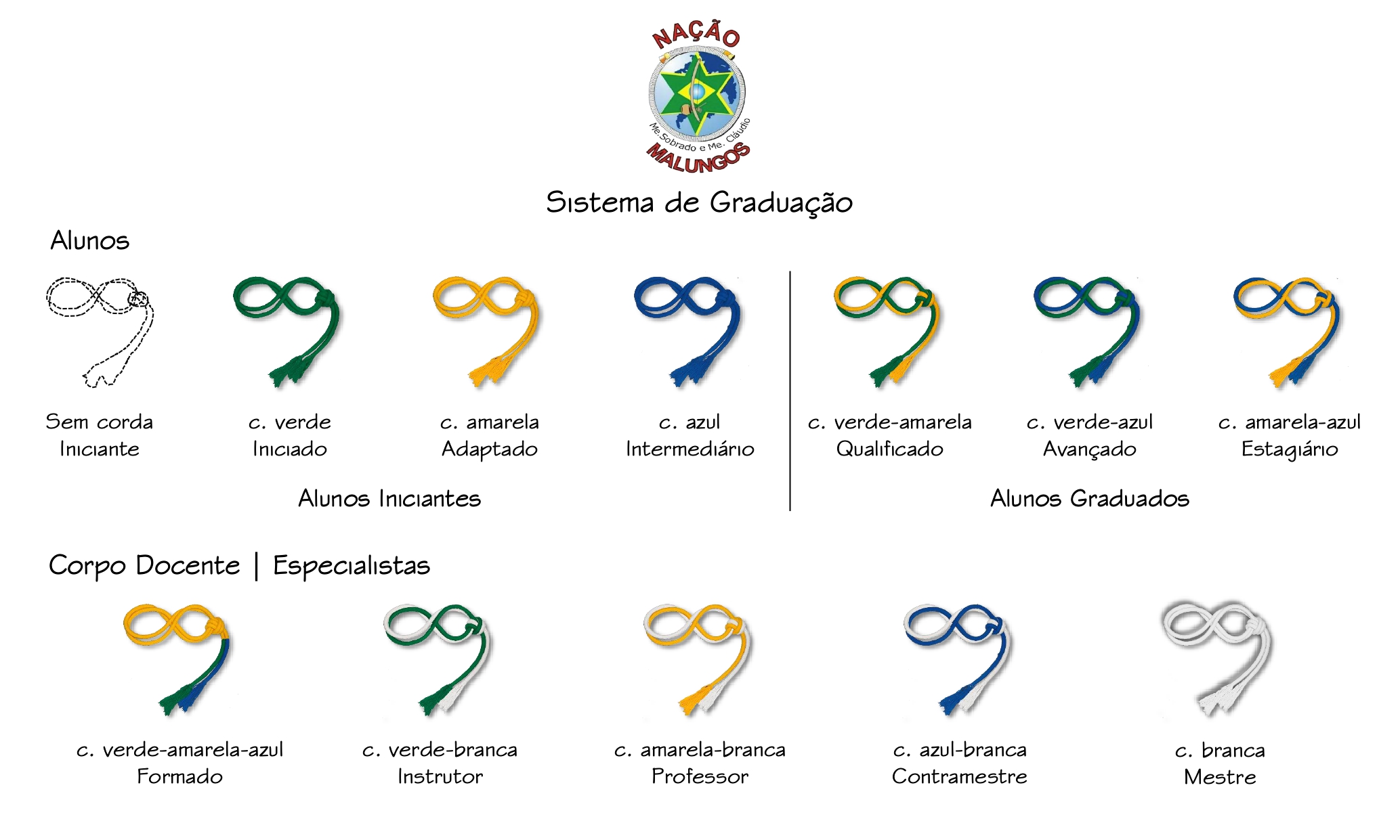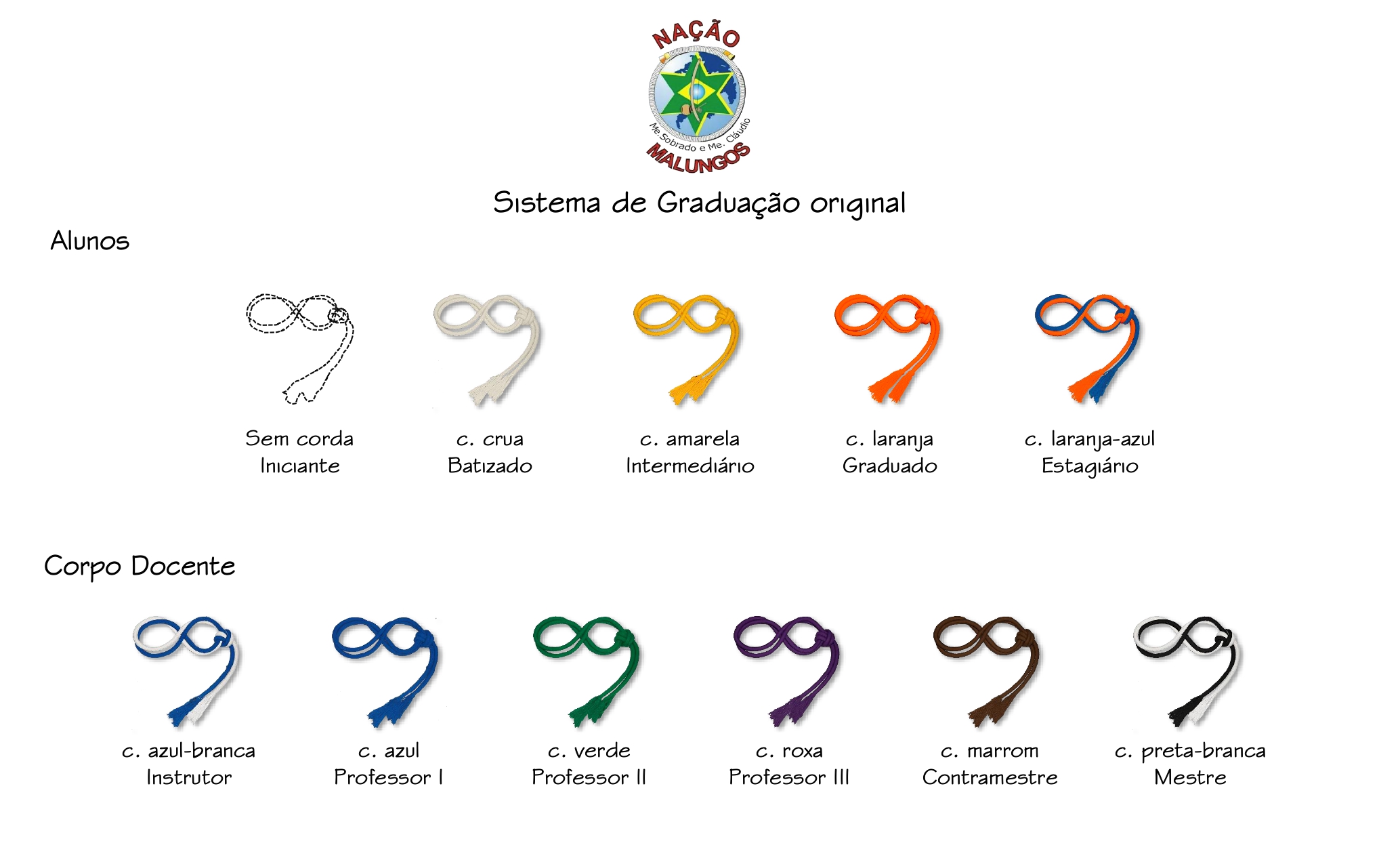 Com relação ao sistema de graduação, ao ser fundado, o grupo Nação Malungos criou um sistema próprio, estabelecido pelas cores das cordas de algodão que seus membros utilizam na cintura e amarram do lado esquerdo da calça. Este primeiro sistema proposto pode ser mais facilmente visualizado a partir da ilustração a seguir: