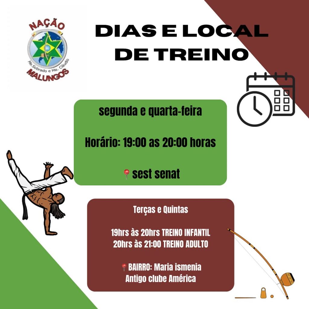 DIA E HORARIO DAS AULAS SEGUNDA E QUARTA-FEIRA As segunda e quarta-feiras, nossas aulas acontecem no SEST SENAT, das 19:00 as 20:00 TERÇAS E QUINTA-FEIRAS As Terças e Quinta-feiras, nossas aulas acontecem no Antigo clube america, No bairro Maria IsmeniaNesses dias, temos dois horarios de aulas.19hrs às 20hrs =Treino infantil20hrs às 21hrs =Treino Adulto